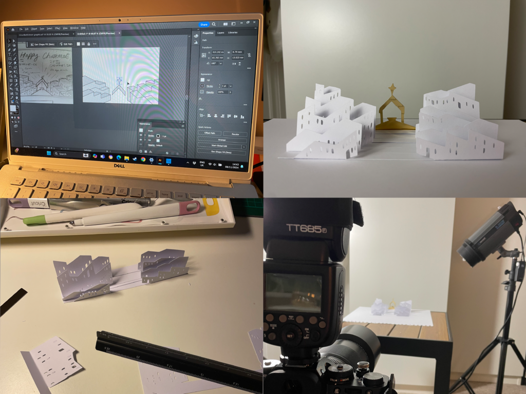 A paper‑crafted graphic style inspired by the 2024 Christmas flyer, reimagined with a refined approach. The use of light and shadow is carefully considered to create depth, texture, and a sense of physicality, resulting in a visually rich and tactile design.